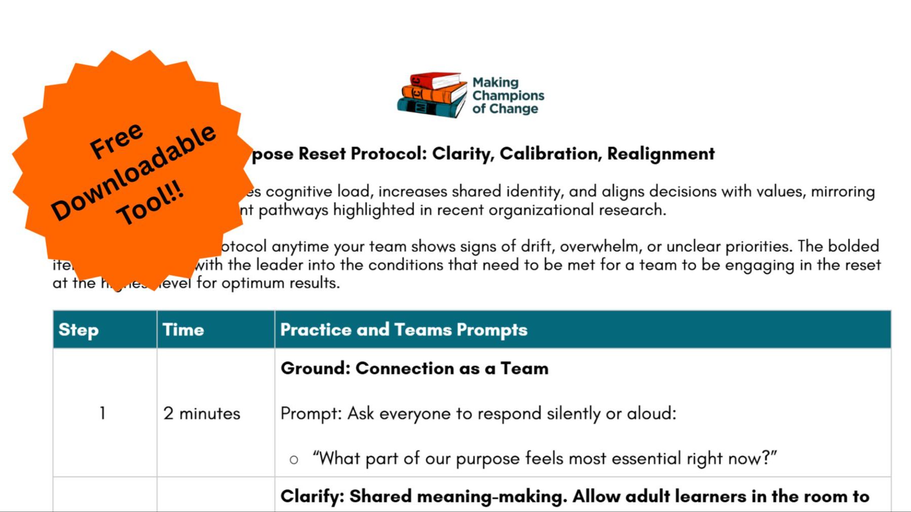 This 14-minute cycle reduces cognitive load, increases shared identity, and aligns decisions with values, mirroring the change of engagement pathways highlighted in recent organizational research. Use this protocol anytime your team shows signs of drift, overwhelm, or unclear priorities. The bolded items share insight with the leader into the conditions that need to be met for a team to be engaging in the reset at the highest level for optimum results. To download this tool and use it with your team to reflect together, click here.