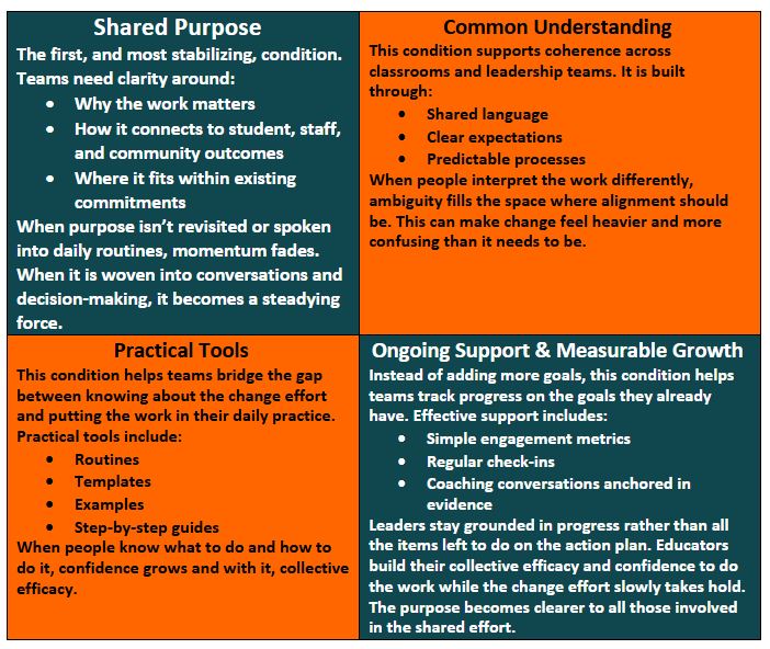 In the Making Champions of Change model, four core conditions determine whether implementation gains traction or stalls: Shared Purpose, Common Understanding, Practical Tools, and Ongoing Support for Measurable Growth. These conditions appear consistently in districts across the country and help explain why even excellent professional learning doesn’t automatically translate into day-to-day practice.